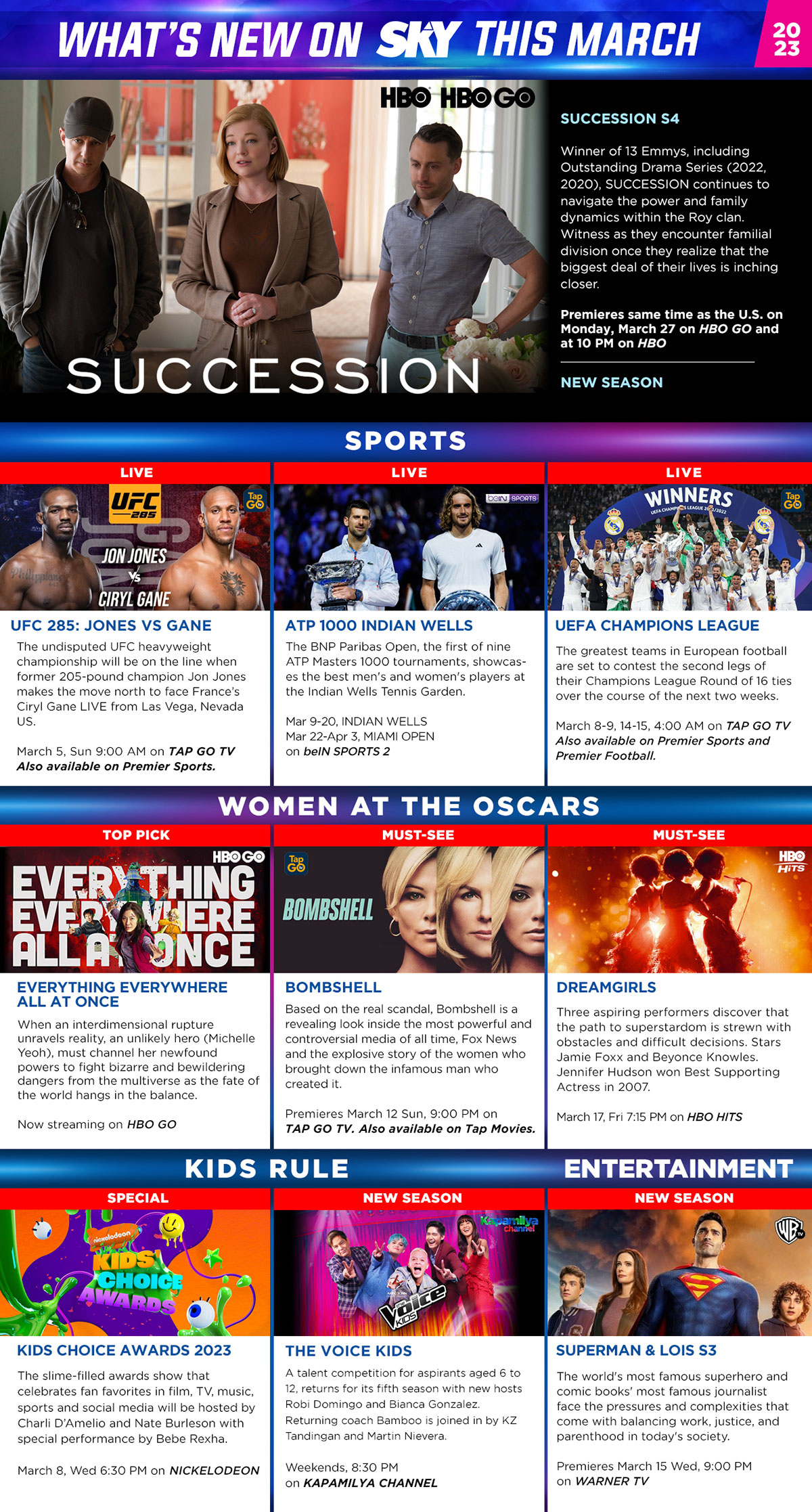 Tune in to Succession for the Roys, Kids Choice Awards for the slime, and content with strong female leads like Bombshell and Superman & Lois for inspiration this March!